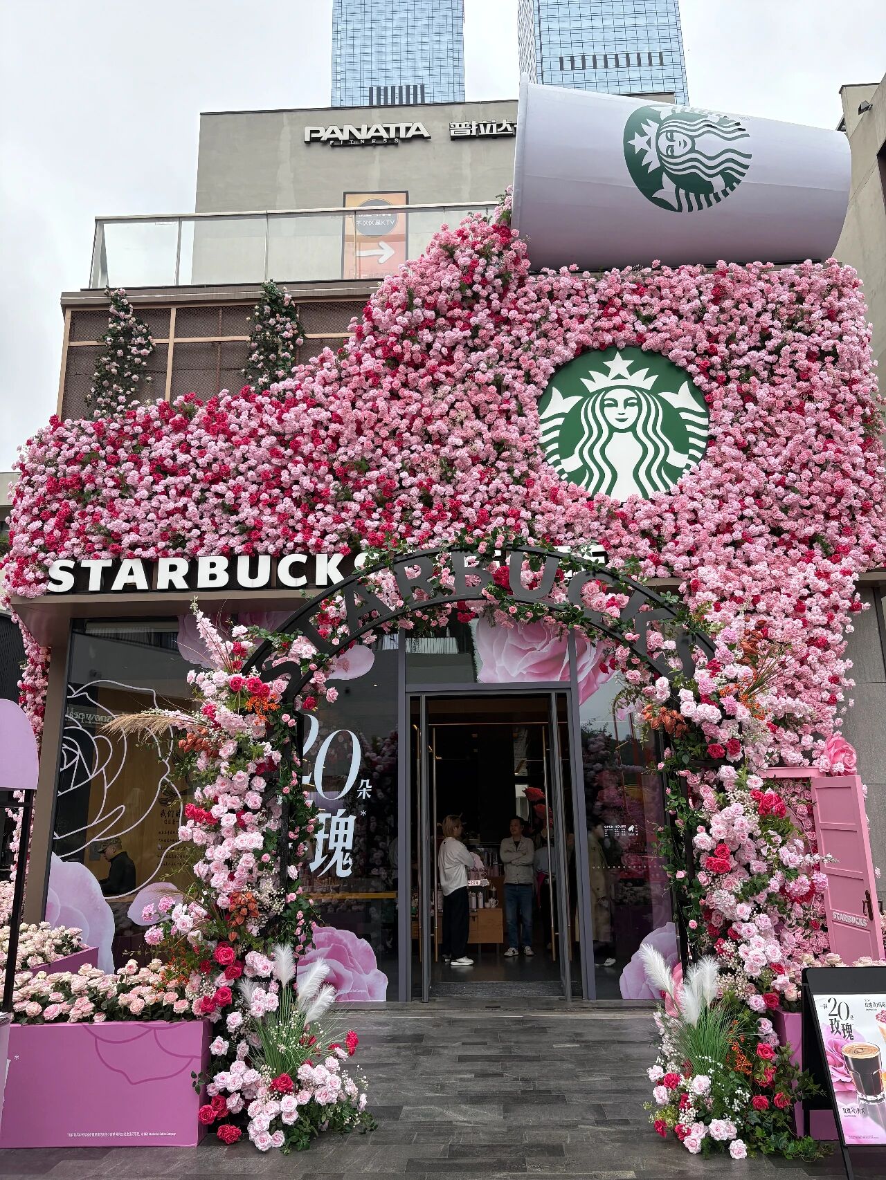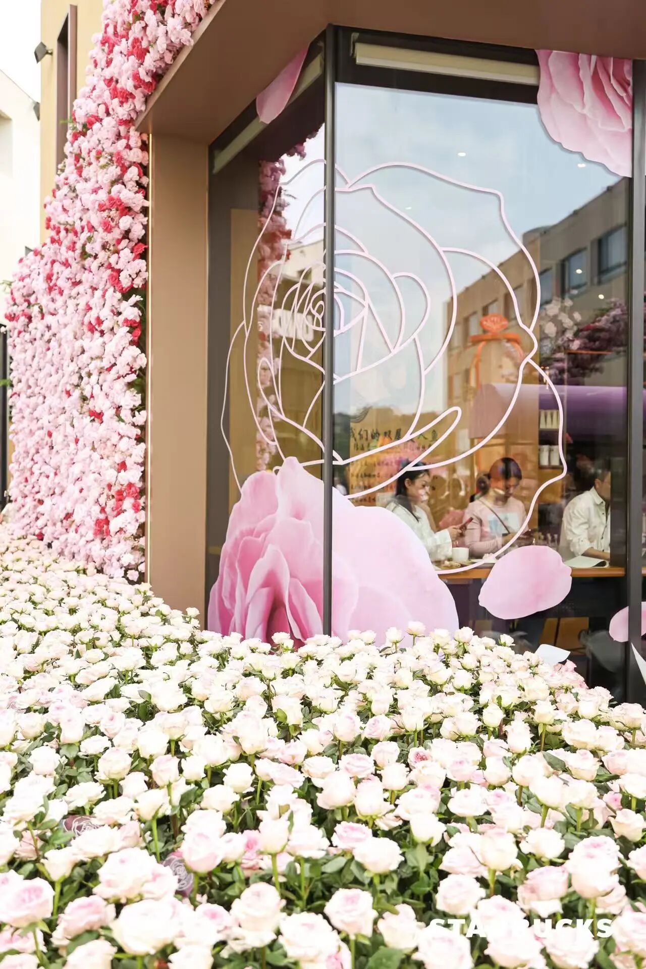 Розы украшают фасад флагманского магазина Starbucks в торговом центре UpperHills в районе Футянь. Фотографии предоставлены Starbucks